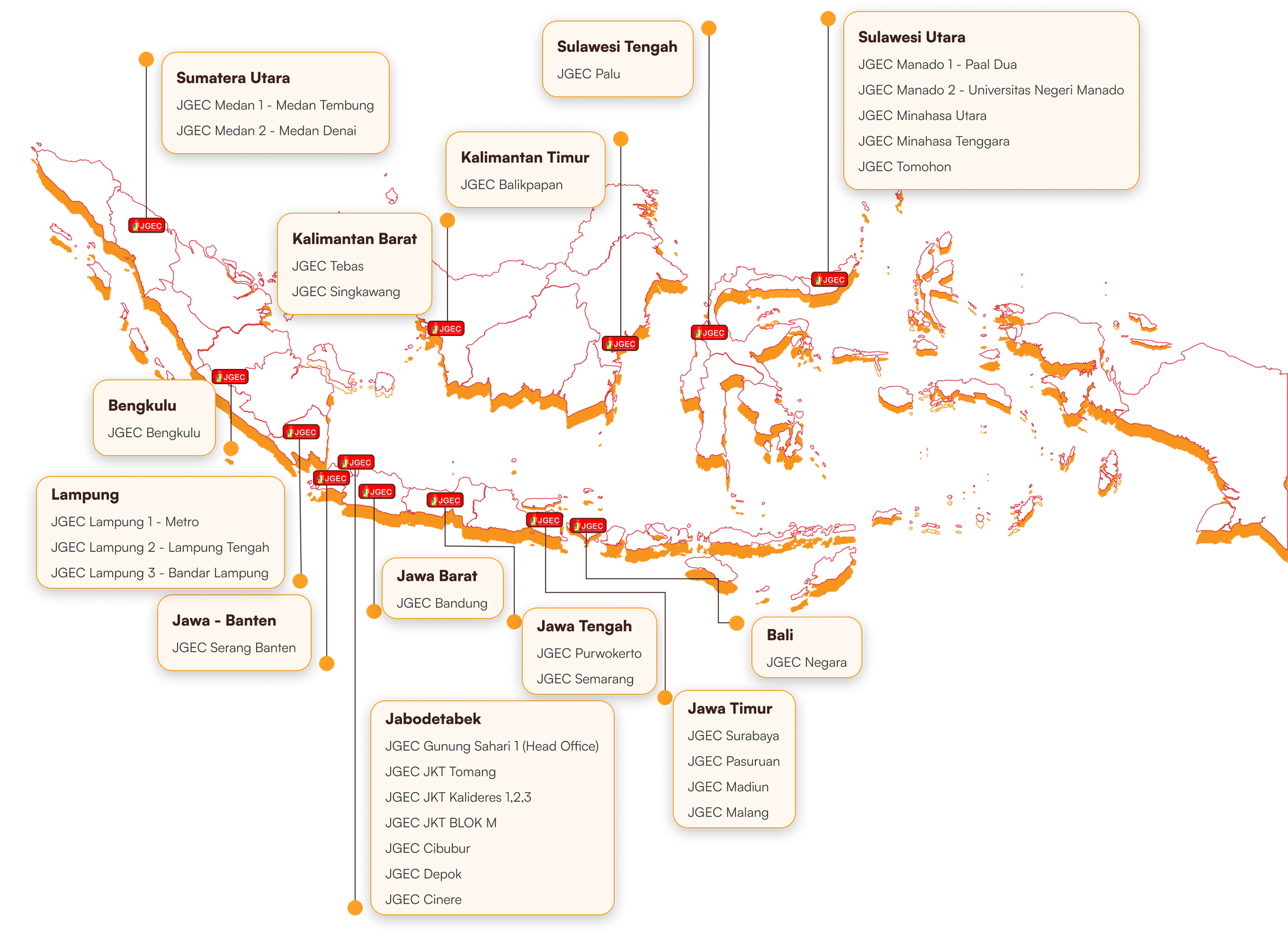 2025年3月現在、インドネシア国内に30校あります。